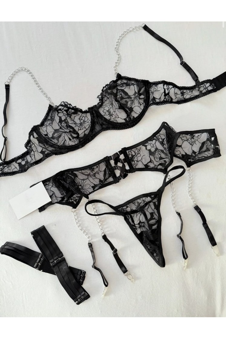 Set de cuatro piezas, incluye ligueros piernas y abdomen, Brasier, panty.