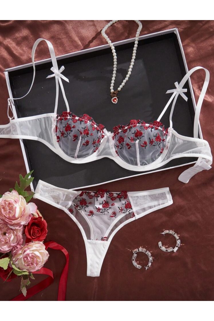 Set de dos piezas de encaje con bordado y trasparencia de rosas, color blanco, panty en algodón recubierto con velo